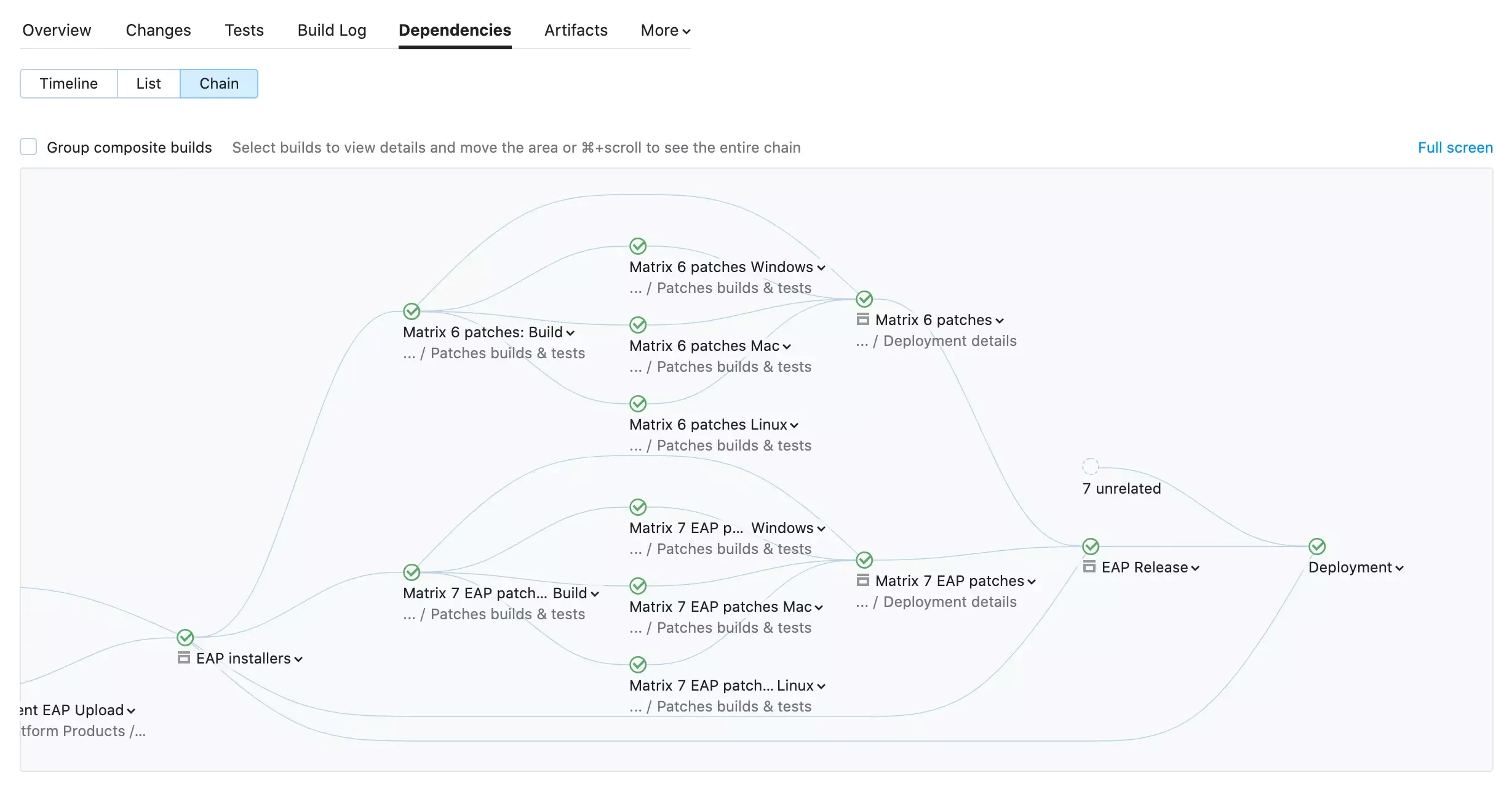 Mit TeamCity wird das Konzept der CI/CD-Pipelines auf eine neue Ebene gebracht. Sie können Anwendungen erstellen, deren Quellcode über viele Repositories verteilt ist, mehrere Builds und Tests parallel ausführen und intelligente Optimierungen nutzen, die Ihnen bei der Ausführung inkrementeller Builds Zeit sparen. Build-Chains helfen Ihnen dabei, Ihren Software-Delivery-Prozess zu strukturieren. Sie können sich somit auf das Schreiben von Code und Tests konzentrieren, anstatt verschiedene Teile von Pipelines miteinander verbinden zu müssen.