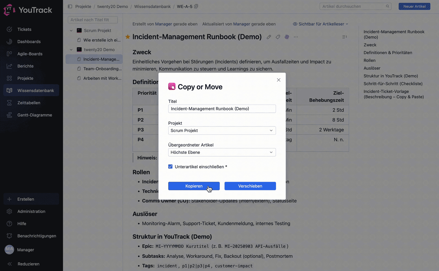 Kopieren oder Verschieben von Artikeln in der YouTrack Wissensdatenbank.