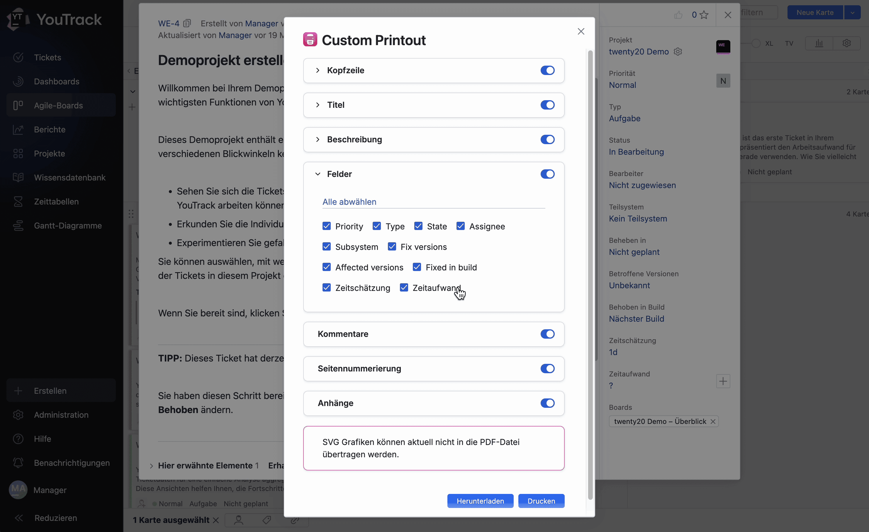 YouTrack bietet umfassende Anpassungsmöglichkeiten und twenty20 liefert dafür die passenden Bausteine – von Marketplace-Apps bis hin zu individuell entwickelten Erweiterungen, die exakt auf die Anforderungen unserer Kunden zugeschnitten sind.