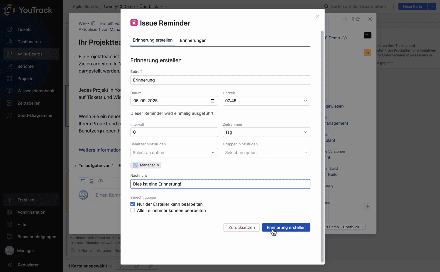 Vergessen Sie nie wieder wichtige Vorgänge mit dieser YouTrack App für individuelle Erinnerungen.