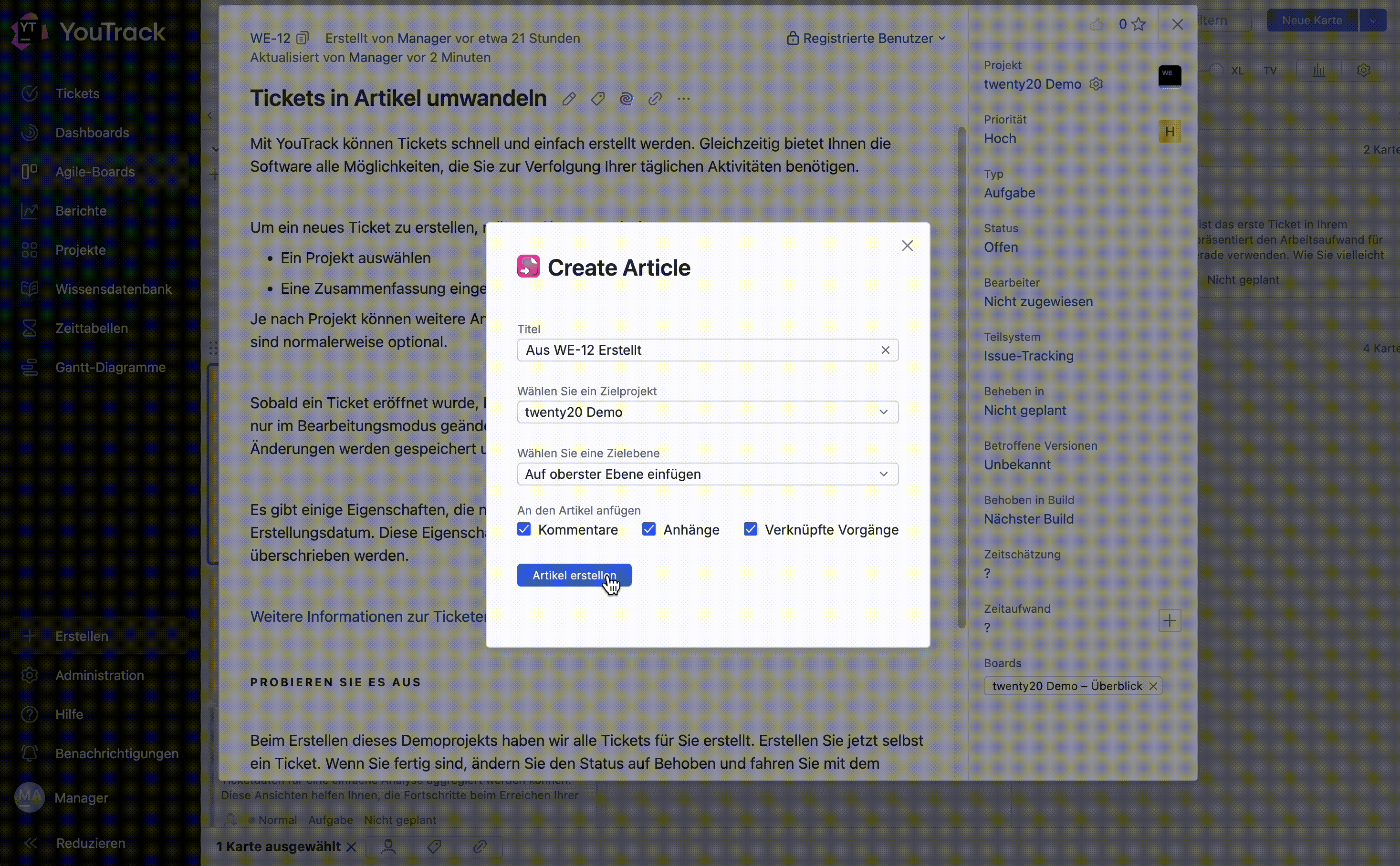 Erstellen Sie aus YouTrack-Issues in wenigen Klicks Artikel für die Wissensdatenbank.